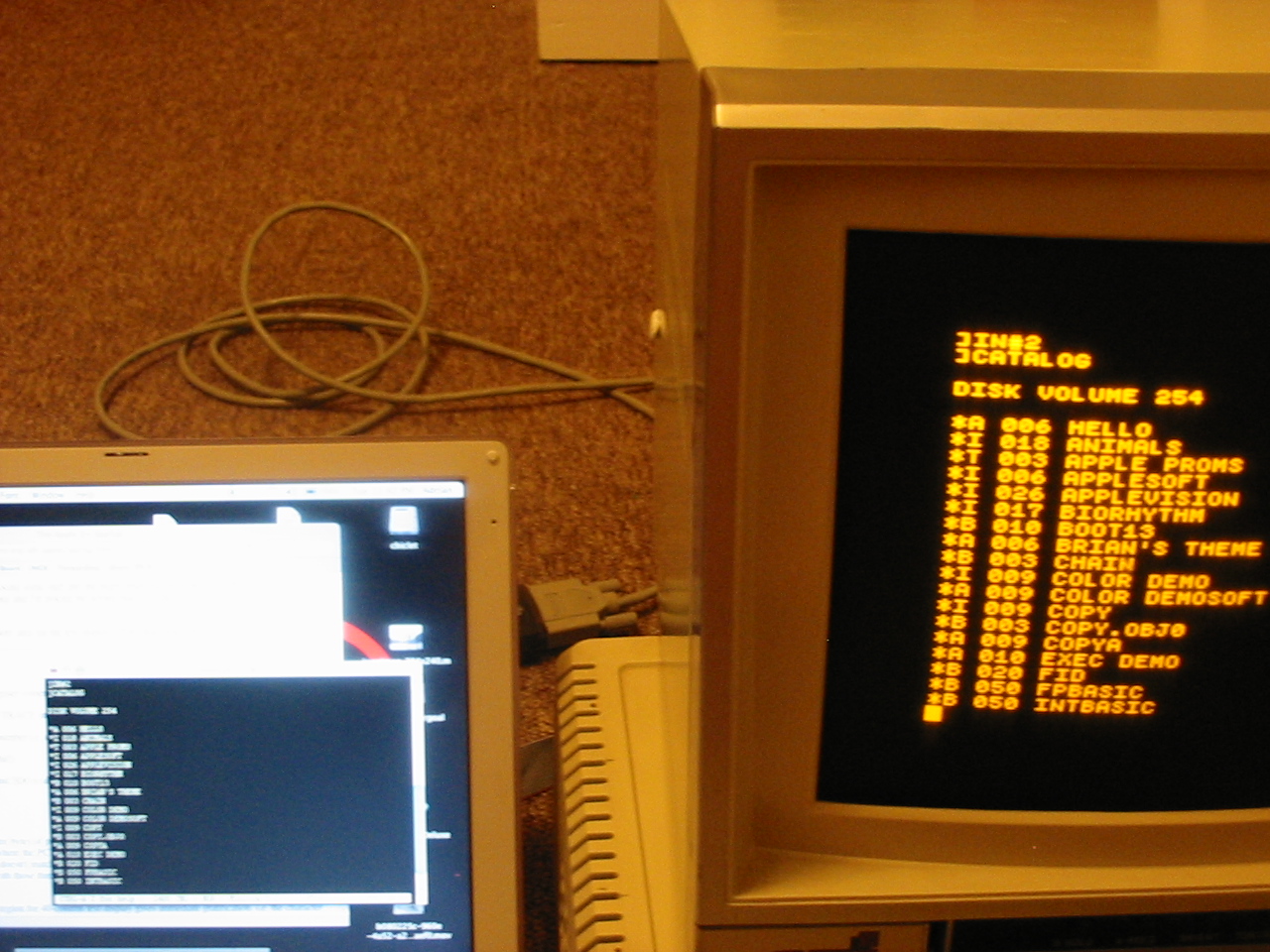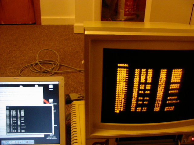 Anyway after the monitor was fixed, I messed around with ADT, which is a really sweet program for transferring disks from an Apple to a file image on a Linux or Windows computer via serial line. Or vice versa, taking an image file and blasting it back to disk. I've been using it for the vice versa. This is important because if I want a usable development environment for doing assembly coding I'll need to get it from the web. I've chosen Merlin, which seems to be highly regarded by ex-Apple ][ programmers.